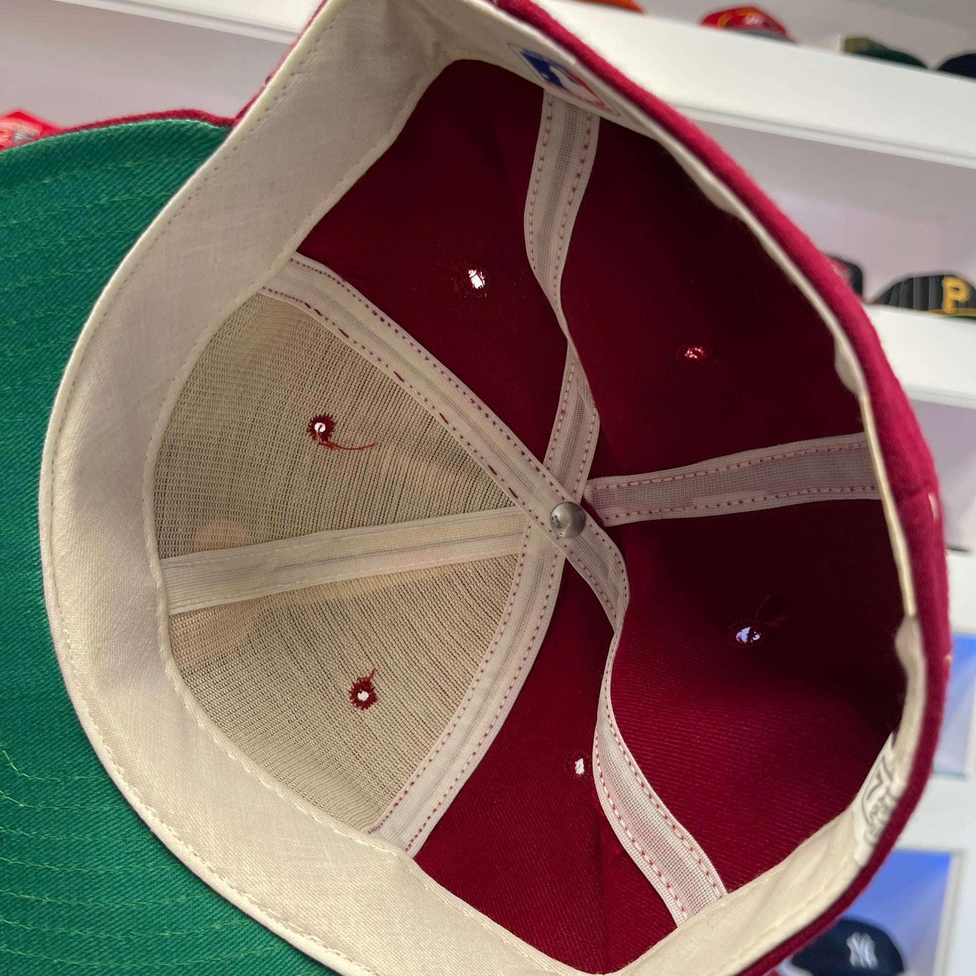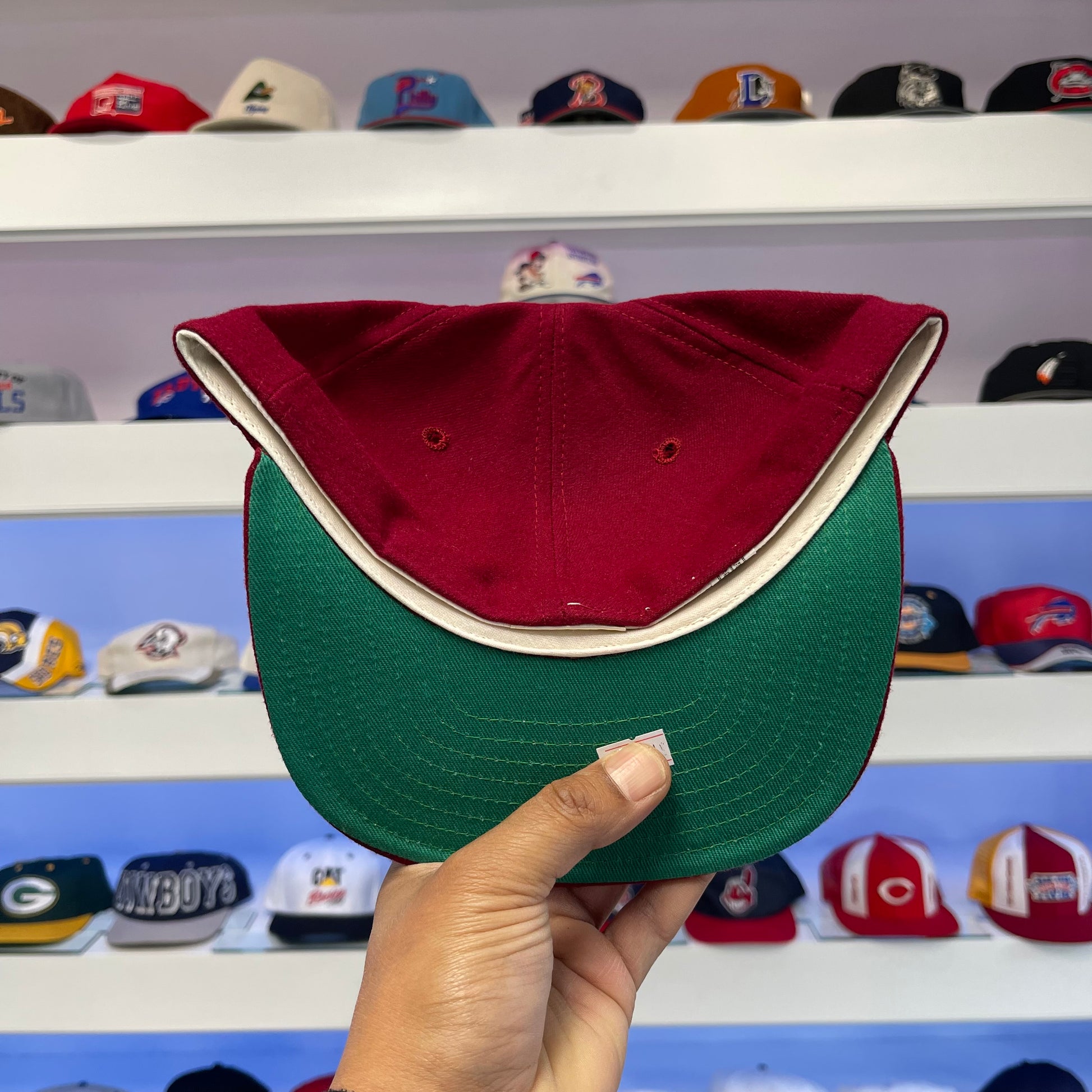 This fitted Phillies cap is made from vintage maroon wool and is a size 7 1/2. The classic style and quality material make it a must-have for any Philadelphia fan. Perfect for completing your game-day outfit or adding to your collection.
