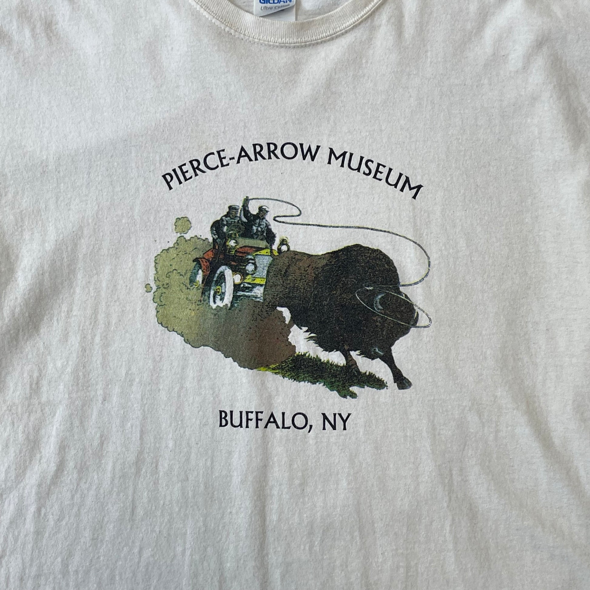 Discover the rich history of the Pierce-Arrow Museum in Buffalo, NY with this vintage shirt. Made with high-quality materials, this size large shirt showcases the iconic logo of the museum. Show off your love for classic cars and expertly crafted shirts with this must-have collector's item.