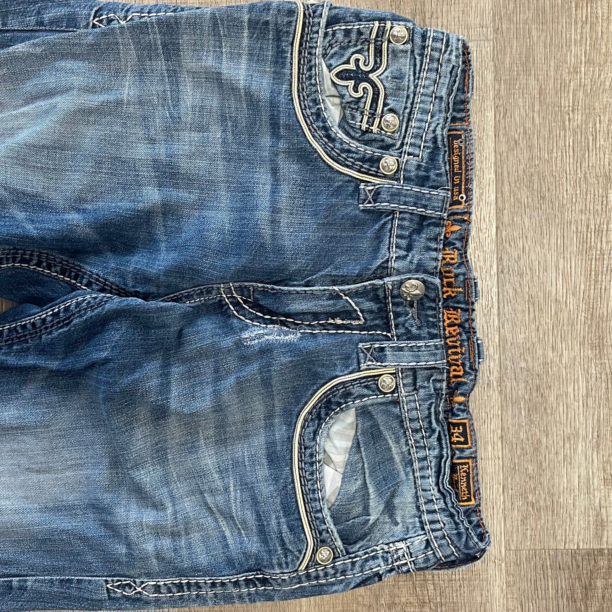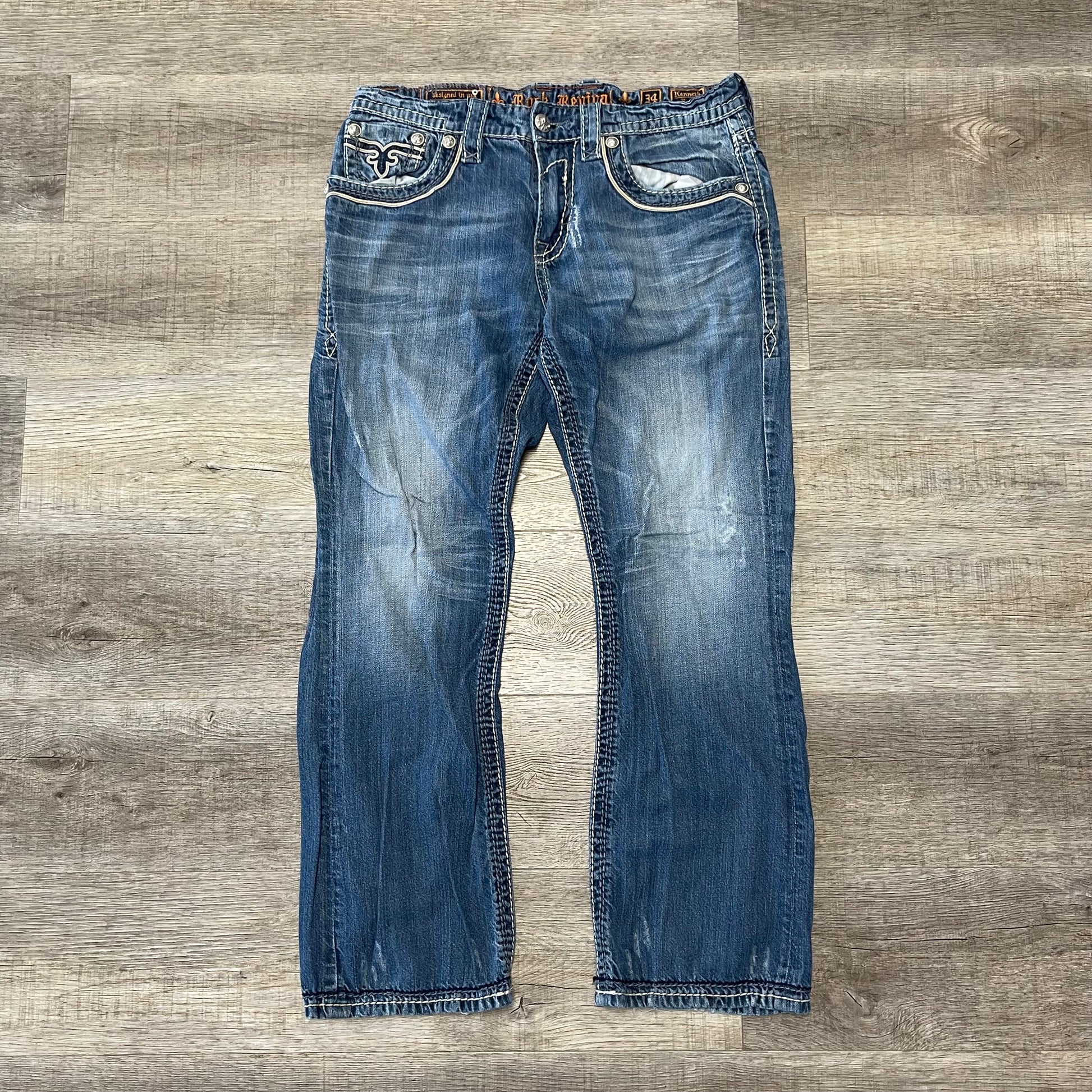 These Vintage Y2K Rock Revival jeans, in size 34x42, offer a stylish and comfortable denim option for the fashion-forward individual. Made with quality material and a classic design, they provide a timeless and trendy look. Upgrade your wardrobe with these durable and flattering jeans.